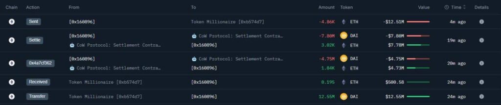 The hacker who stole funds from a Coinbase user purchased 4,863 $ETH for $12.5M in $DAI at a price of $2,569.
