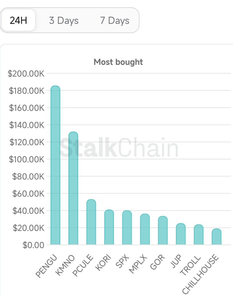 JUST IN: $PENGU, associated with Pudgy Penguins, is the leading smart money purchase over the past 24 hours and 7 days, as reported by Stalkchain.