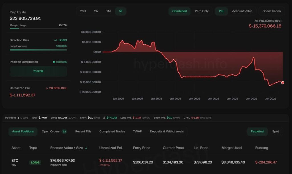 He initially opened positions worth $424M, but has reduced his exposure from 3,952.66 $BTC to 736.5 $BTC.