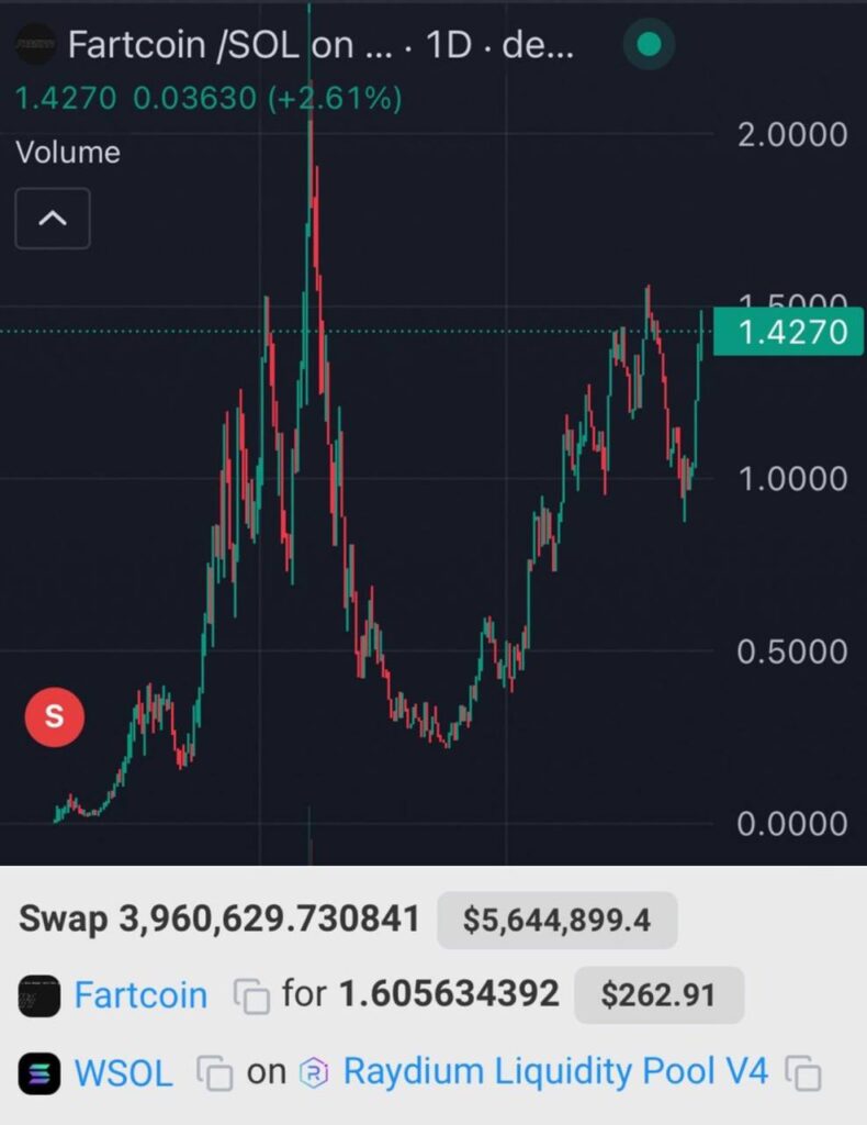 Someone bought $163 Fartcoin and sold it for $83 profit which now worth over $5,600,000
