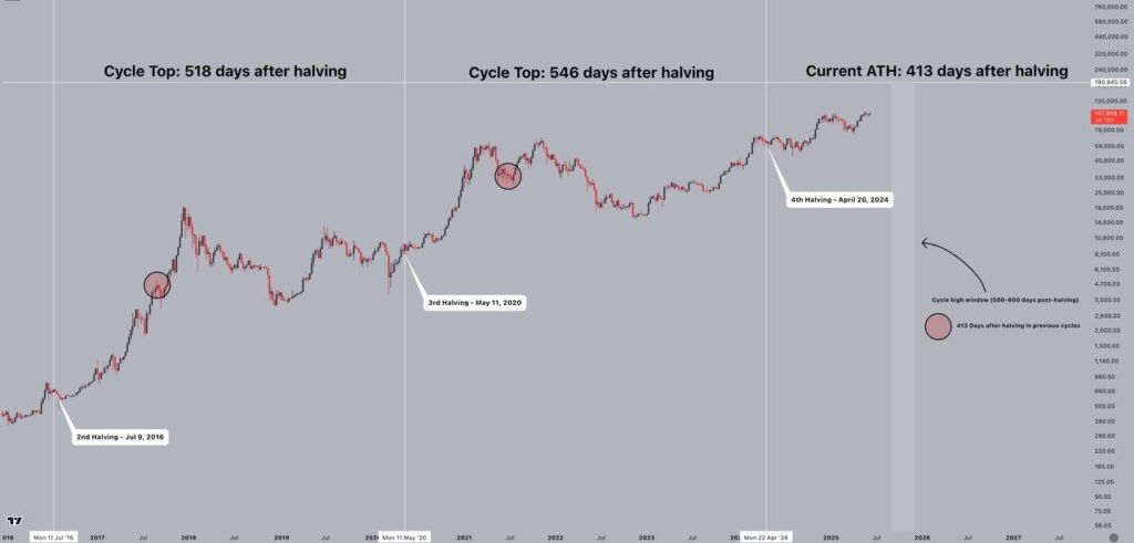 In the previous two cycles, Bitcoin kept running for 500+ days after the halving event. Both of these cycles lasted