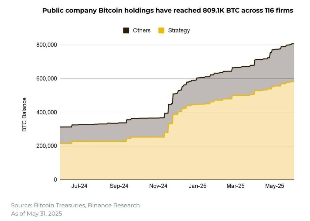 Public companies now hold over 800K BTC 116 public companies collectively hold 809,100 BTC — up from 312,200 just a