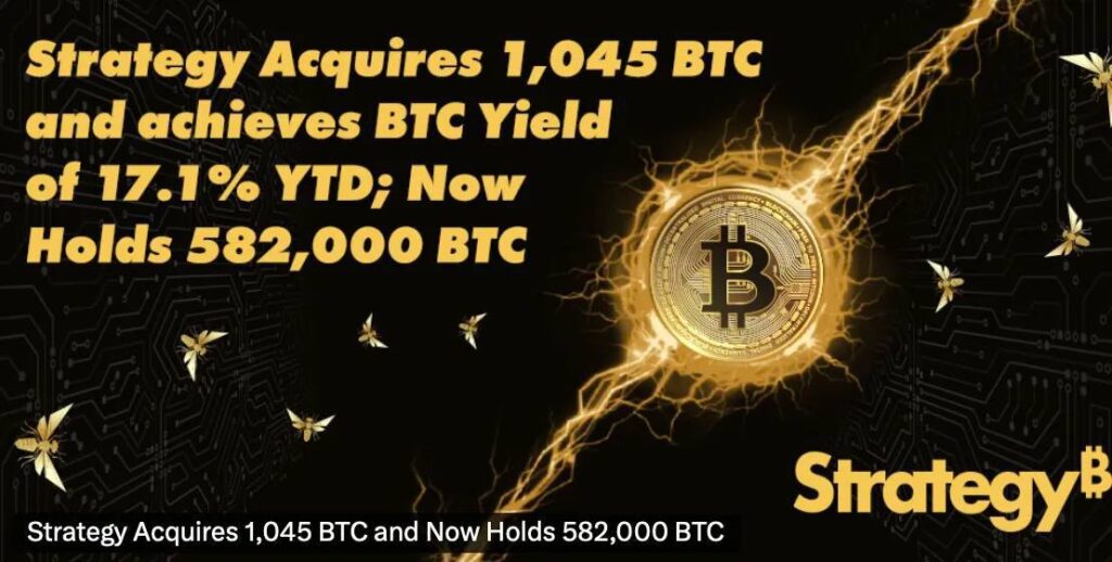 MicroStrategy adds 1,045 BTC for $110.2M As of June 8, 2025, the firm holds 582,000 BTC worth ~$40.79B. Average cost