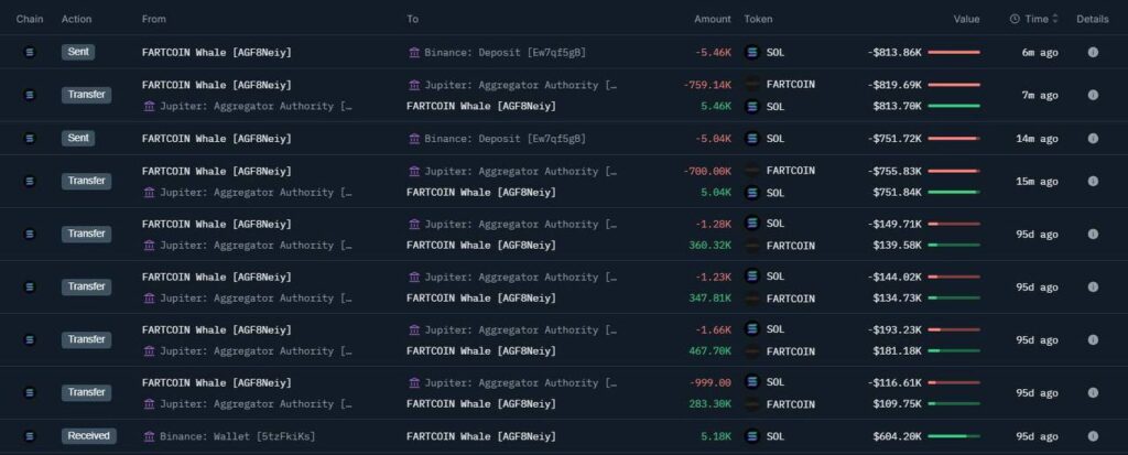 One major holder sold 1,459,000 $FARTCOIN for 10,509 $SOL (approx. $1.57M) at a price of $1.07, then transferred the funds to Binance.