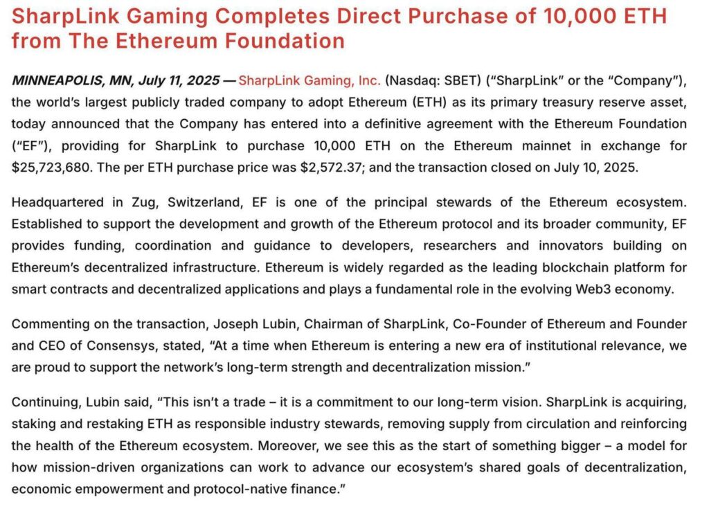 SharpLink Gaming has acquired 10,000 ETH (~$30M) directly from the Ethereum Foundation.