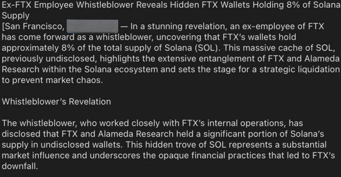 FTX whistleblower reveals the exchange still holds ~8% of SOL supply in hidden wallets — about $5B worth.