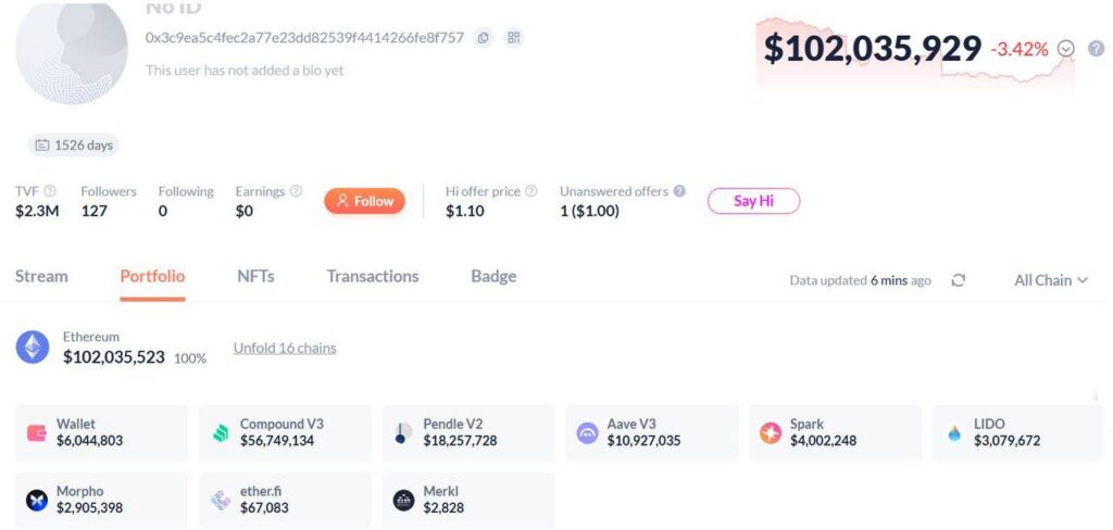 This whale is a king of DEFI with a lot of assets in different protocols: